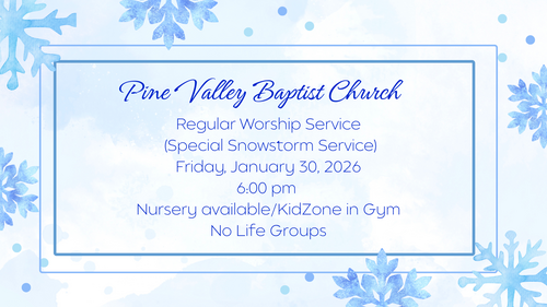 Pine Valley Baptist Church is a warm, friendly, and welcoming church that believes and preaches God's Word. Our services are a blend of hymns and contemporary songs that focus on worshiping the Lord. Each Sunday, our choir, praise team, and band lead us in worship, and our pastor teaches from the Bible.